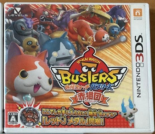 3ds_cart: 妖怪ウォッチバスターズ 赤猫団 (【特典】・レッドJメダル(Bメダル)・赤猫団オリジナルステッカー 同梱) - 3DS_4571237660665 (conf: 0.988)